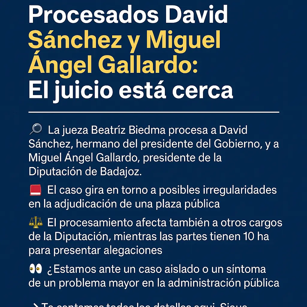 La jueza Beatriz Biedma ha decidido procesar a David Sánchez, y a Miguel Ángel Gallardo, presidente de la Diputación de Badajoz. Esta resolución representa un paso crucial antes de la apertura formal del juicio oral en un caso relacionado con la adjudicación de la plaza de coordinador de Artes Escénicas.