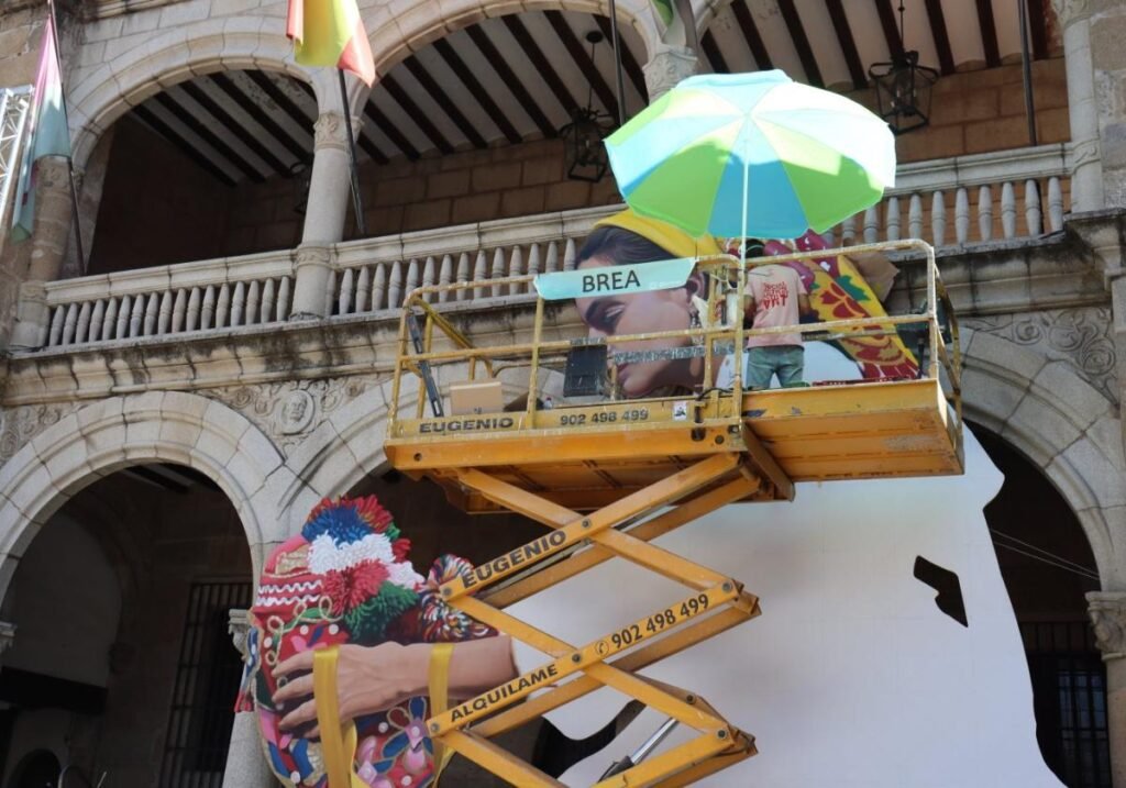El vibrante mural La Montehermoseña, creado por el artista urbano placentino Jesús Mateos Brea, regresa a la Plaza Mayor de Plasencia en 2025 para engalanar el Martes Mayor, una festividad