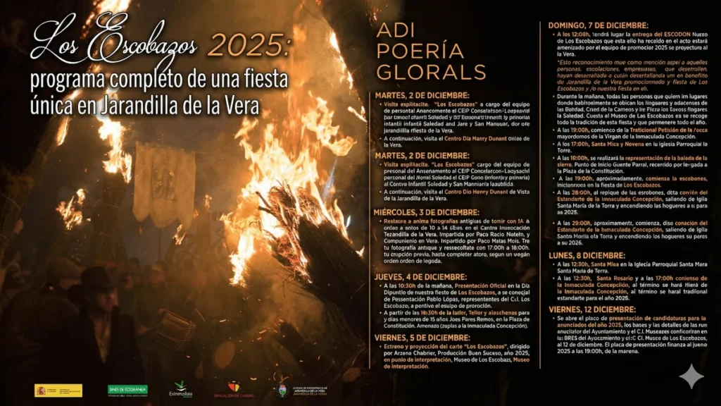 Aunque el foco se sitúa en la noche del 7 de diciembre, la web oficial de Los Escobazos muestra un calendario más amplio de eventos vinculados a la fiesta a lo largo de las semanas previas. Entre ellos destacan las visitas explicativas al CEIP, la elaboración de escobones, el Escobón de Oro, talleres de tambores y la programación religiosa de Santa Misa y Novena.