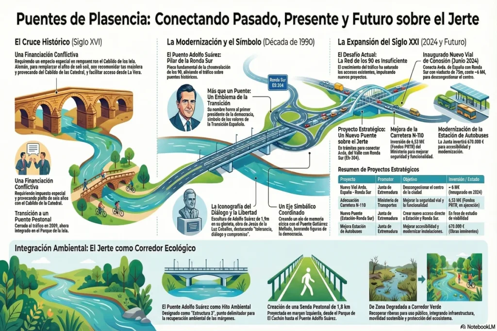 Nuestro recorrido finaliza donde empezó: a orillas del Jerte. Hemos viajado desde la robusta piedra del Puente Nuevo del siglo XVI, nacido de la urgencia y el conflicto, hasta la modernidad funcional de los puentes de los años 90, que son a la vez arterias de tráfico y monumentos a la democracia. Ahora, miramos hacia un futuro que se construye con nuevos viales y la promesa de otro gran puente, diseñado para resolver los desafíos del siglo XXI.