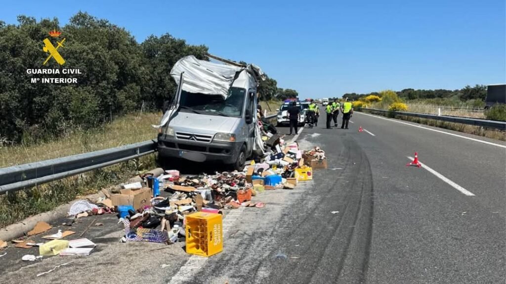 Tráfico cortado en la EX-A1: Colisión entre un camión y un furgón en Majadas de Tiétar con un herido